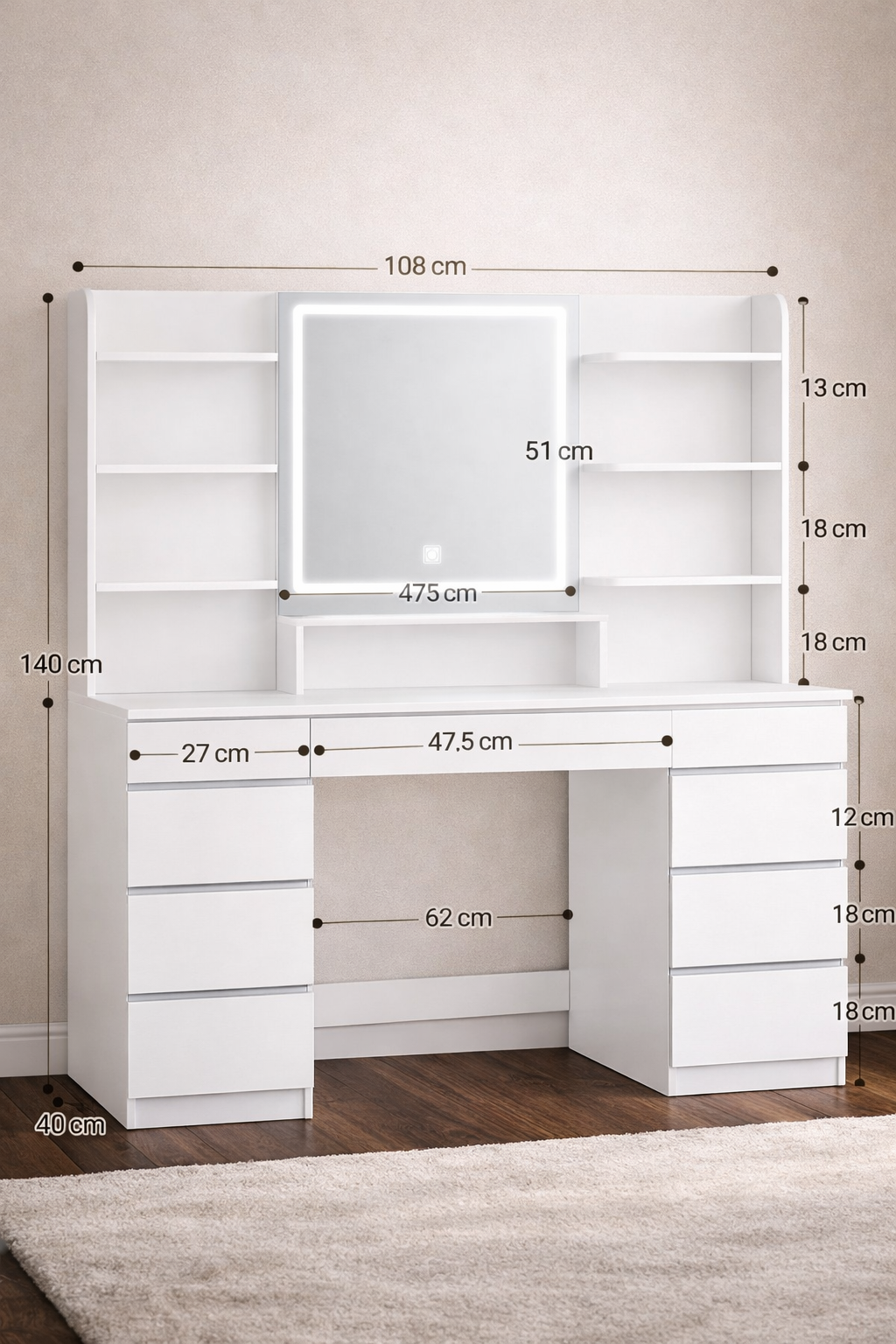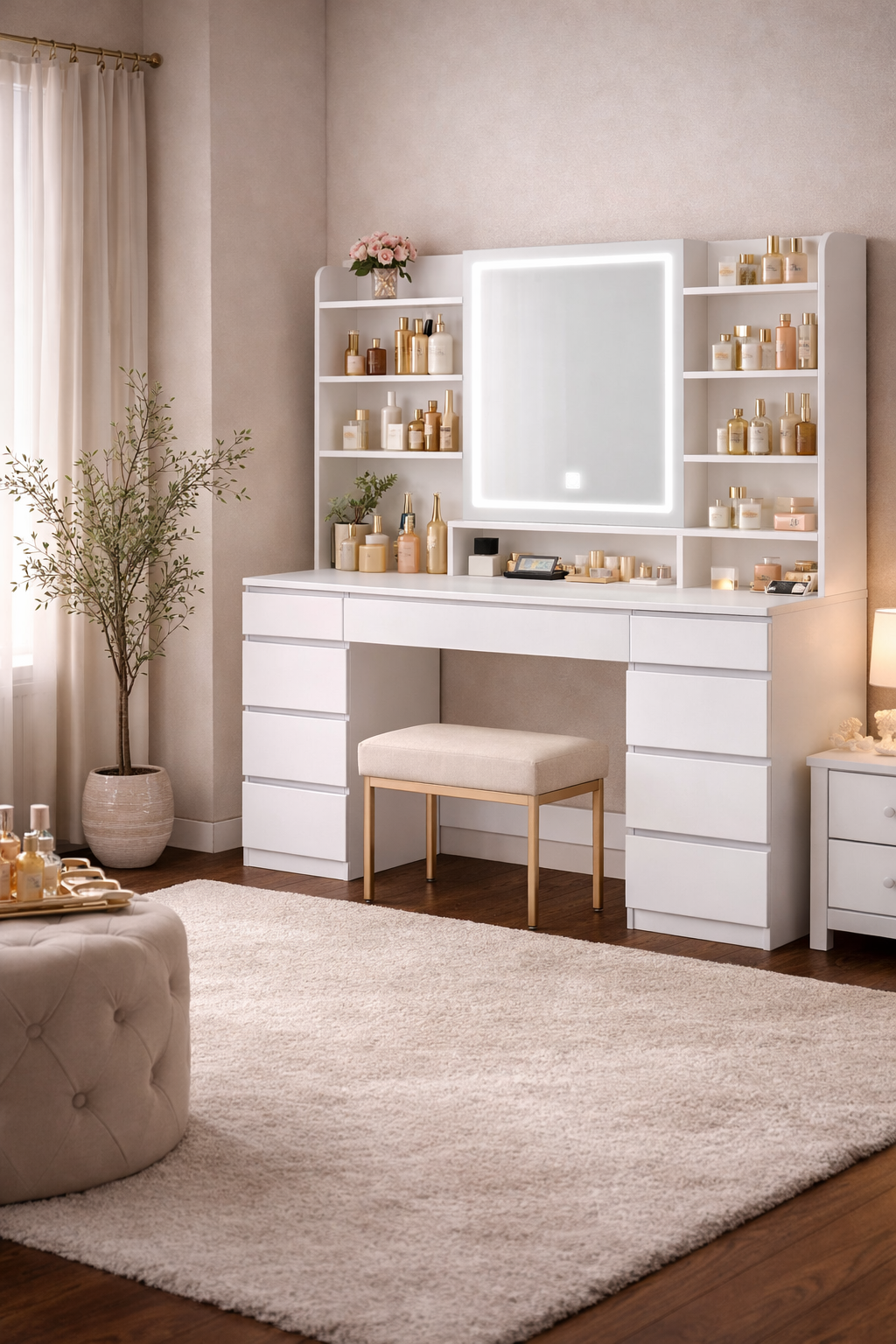 Avec sa finition blanche lumineuse et ses lignes contemporaines, la coiffeuse LUMINA s’intègre parfaitement dans une chambre moderne, féminine ou luxueuse.