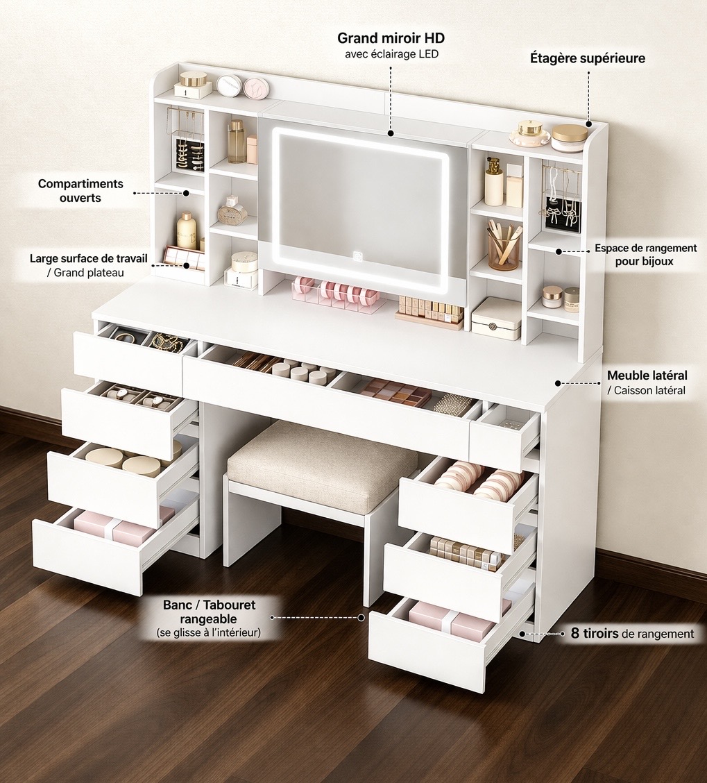 Sa large surface de travail et ses multiples espaces de rangement, incluant 8 tiroirs spacieux et des compartiments ouverts, permettent d’organiser facilement cosmétiques, accessoires et bijoux. Son tabouret compact encastrableoptimise l’espace et assure un confort d’utilisation au quotidien.
