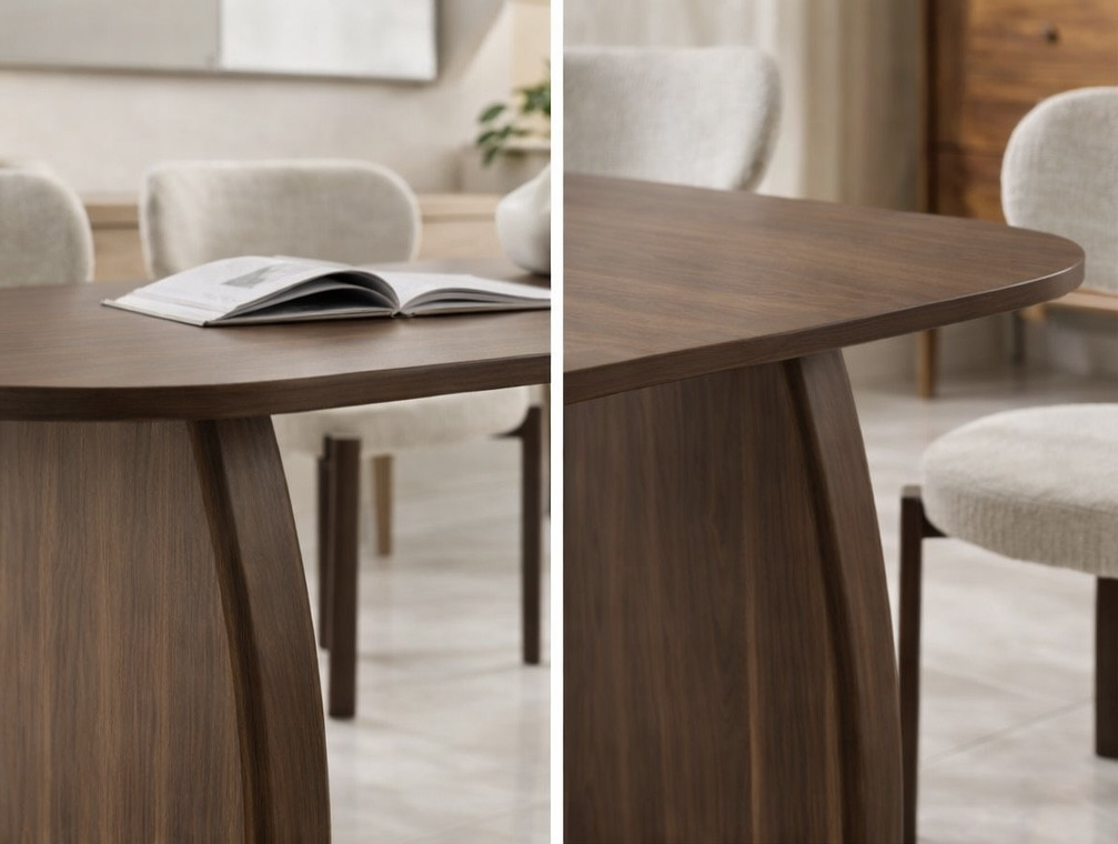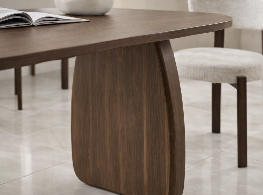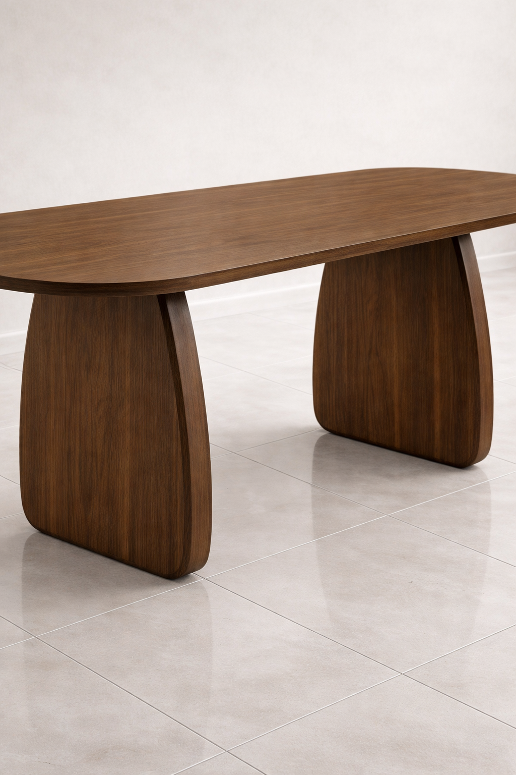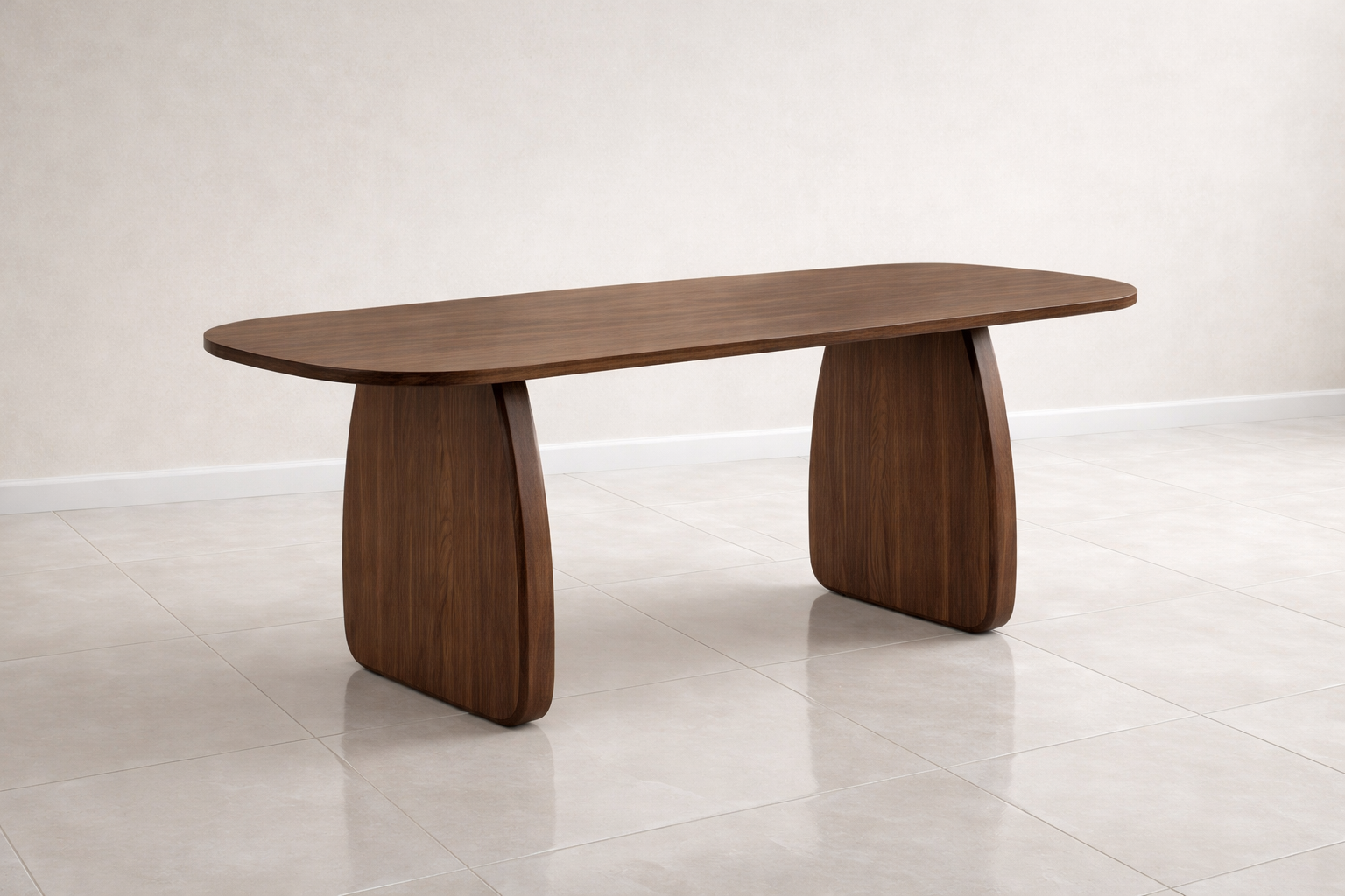 La table à manger Nara séduit par son design architectural et ses lignes organiques parfaitement équilibrées. Son plateau aux angles adoucis repose sur deux pieds centraux sculpturaux qui lui confèrent une silhouette contemporaine forte et raffinée.