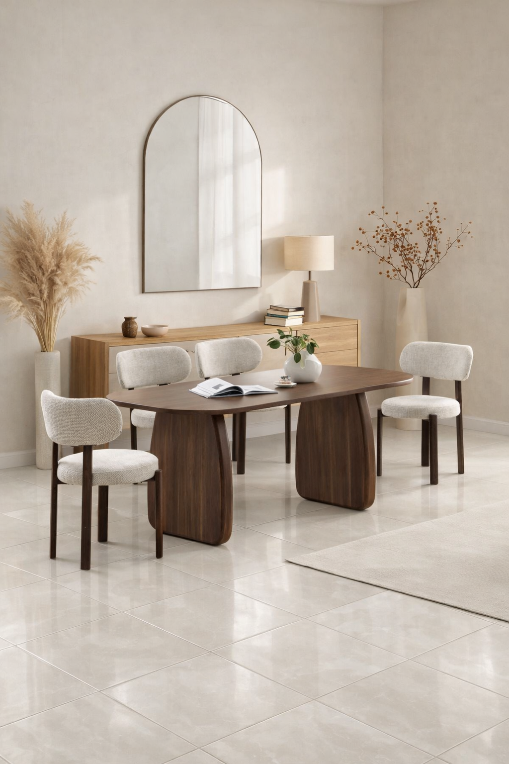 La table Nara s’exprime pleinement dans un environnement épuré et lumineux. Associez-la à des chaises en tissu texturé ou bouclette dans des tons naturels afin de créer une ambiance japandi douce et sophistiquée.