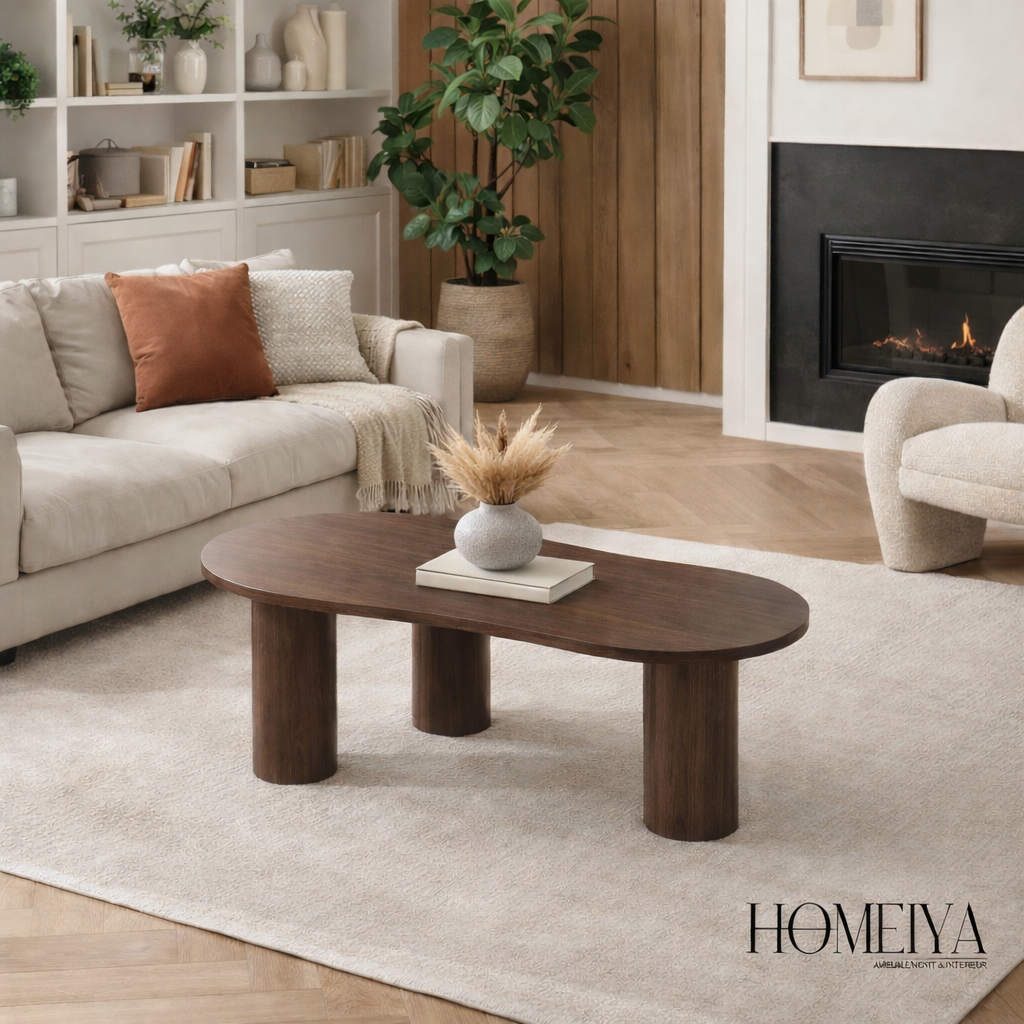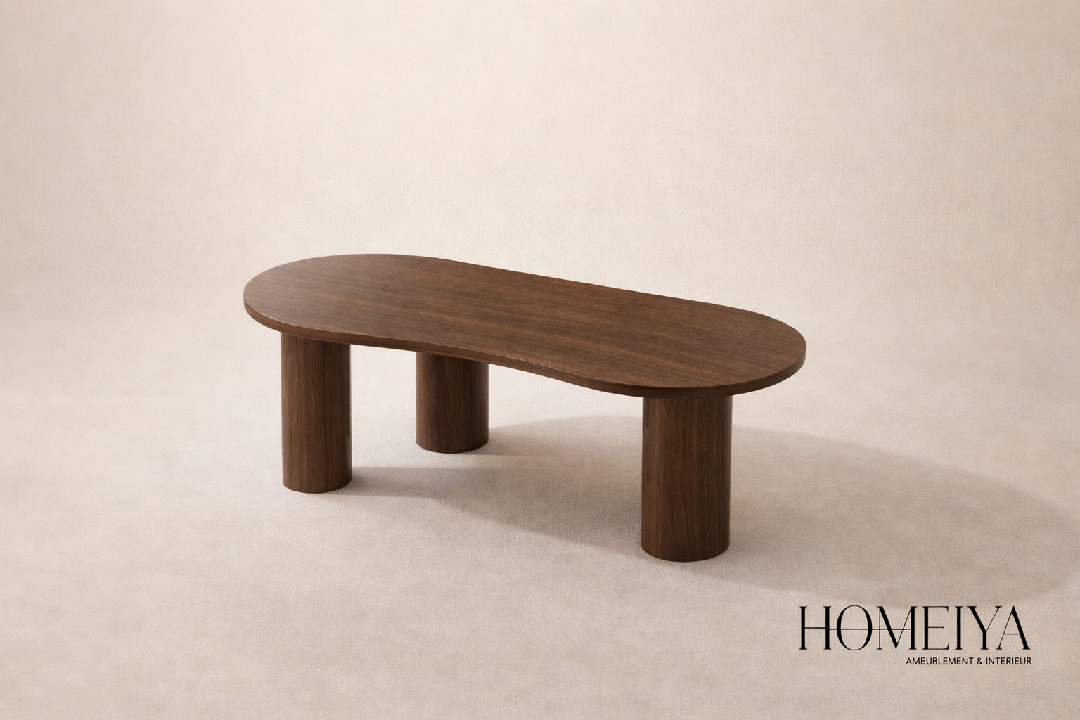 La table basse Noya séduit par ses lignes fluides et son design organique, inspiré de l’architecture contemporaine. Son plateau ovale aux courbes douces repose sur trois pieds cylindriques, créant une silhouette sculpturale à la fois stable, équilibrée et visuellement légère.