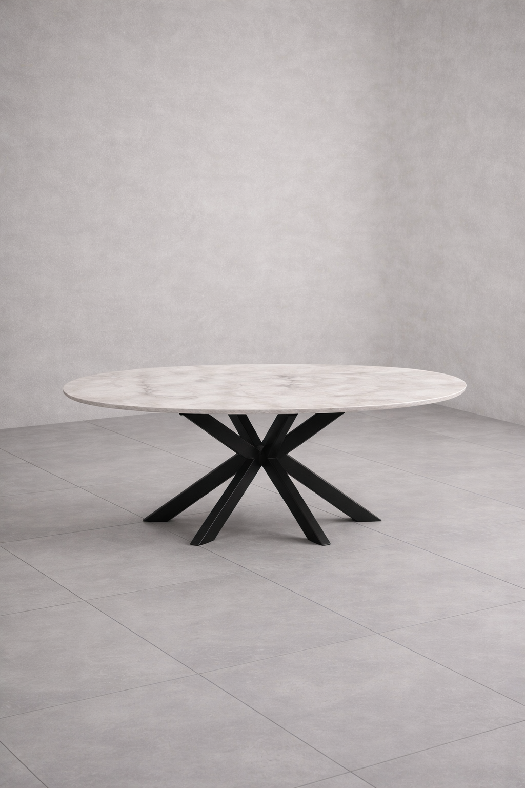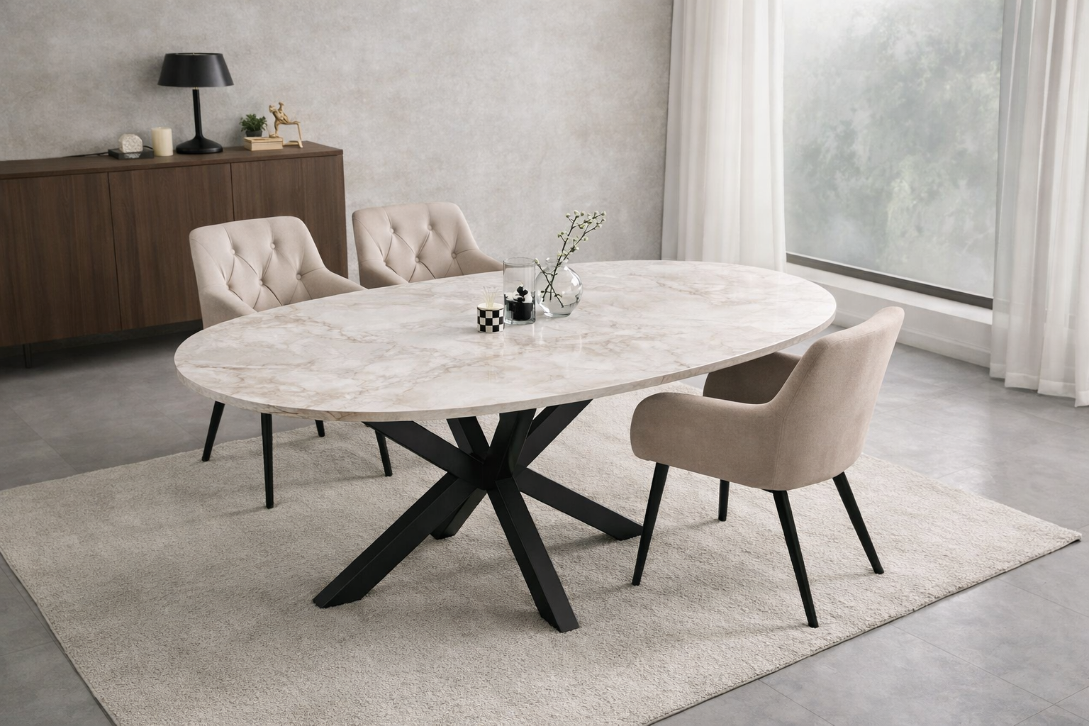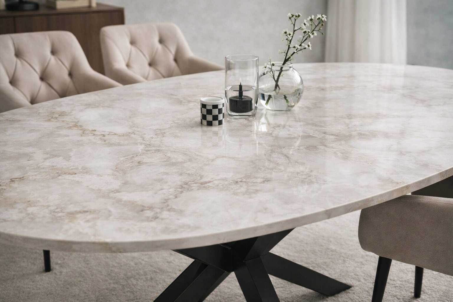 Élégante et contemporaine, cette table ovale séduit par son plateau en marbre effet nacré aux nuances beige, crème et taupe très lumineuses.